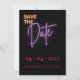 Eine fette, moderne Neonschild Save the Date Karte in hellorange und lila auf schwarzem Hintergrund. Auf der Rückseite der Karte befindet sich ein neonfarbenes Herz und ein leuchtend rotes Einladungs-Zeichen. Verkünden Sie Ihre bevorstehenden Nuptials in kühnen, neonfarbenen Tönen an Ihre Familie und Freunde. Das werden sie bestimmt nicht verpassen! Wenn Sie die Farben der Neonzeichen ändern möchten, wenden Sie sich bitte an den Designer. Hinweis: Der Neoneffekt kommt am besten auf glänzenden oder halbglänzenden Papieren zum Vorschein.