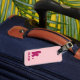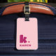 Gepäckanhänger mit dem Monogramm-Initial in einem großen, fetten Schriftart und Ihrem Namen unten. Burgundy Text auf einem rosa Hintergrund. Farben sind im Designwerkzeug anpassbar. Fügen Sie Ihre Kontaktinformationen auf der Rückseite ein.