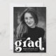 Fett abgestufte Einladungen mit dem vertikalen Foto des Absolventen mit "grad" in fett weißer Schrift. Personalisieren Sie die Foto Graduation Party einlädt, indem Sie den Namen des Absolventen, Abschluss Jahr und Schule. Die Schwarz-Weiß-Graduierungsparty lädt zur Rückseite ein, um Ihre Party-Details anzuzeigen.