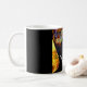 Eine Tasse mit einem Elefantenkopf in kräftigen, lebendigen Gelb-, Grün-, Orange- und anderen Farben, die ihm einen zufälligen abstrakten Look verleihen. Set auf schwarzem Hintergrund. Personalisieren mit einem Namen.