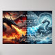 Diese epische Fantasy-Szene erzählt die Geschichte eines Drachen mit zwei mythischen Geschöpfen aus Feuer und Eis. Der Feuerdrache, die Schuppen leuchten wie geschmolzener Fels, stürzt durch einen dunklen, rauchten Himmel, in Flammen verstrickt. Der in Blau- und Weißtönen schimmernde Eisdrache erhebt sich aus einer gefrorenen, kristallinen Landschaft, die einen eisigen Nebel ausatmet. Der Hintergrund ist eine dramatische Gegenüberstellung von Feuer und Eis. Der Titel "FIRE & ICE" wird oben deutlich angezeigt