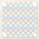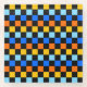 Ein lebendiges Schachbrettmuster mit abwechselnden Reihen aus orangefarbenen, gelben, hellblauen und blauen Quadraten vor einem schwarzen Hintergrund. Das Design ist kühn und energiegeladen.