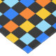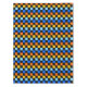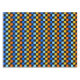 Ein lebhaftes Schachbrettmuster mit abwechselnden Reihen aus orangefarbenen, gelben, hellblauen und blauen Quadraten vor einem schwarzen Hintergrund. Das Design ist kühn und energiegeladen.