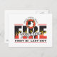 Feuerwehrkampf mit Axt im Feuerwehrschild mit flammendem FEUER- und RESCUE-Text! Starker und tapferer Obertext mit 1. IN LAST OUT weiter unten! Großartiges Brandbekämpfungsgeschenk!