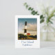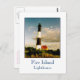 Auf dieser Postkarte befindet sich ein Foto des Leuchtturms von Fire Island gegen einen goldenen Sonnenuntergang. Das Fire Island Lighthouse befindet sich auf dem Fire Island National Seashore Land, am Western Ende dieser Barriere Island, vor der Südküste von Long Island.