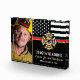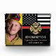 Dieses Design ist mit einer Feuerwehrflagge mit schwarz-weißen Streifen und einem dünnen roten Streifen versehen. "Glückwunsch" und das Abzeichen eines Feuerwehrmanns sitzen über dem Namen des schließend oder pensionierten Feuerwehrmanns, Leutnants oder Chefs. Feiern Sie stilvoll! Mit einem Foto des ausscheidenden Feuerwehrmanns können Sie sich noch weiter anpassen.