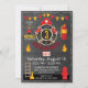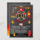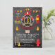 Fireman Thema Geburtstagskarte Design mit Flammen, Feuerwerk, Axt, Feuerlöscher, Leiter, Kegel, Hydranten und Feueralarm über Chalkboard-Look Hintergrund.