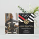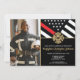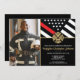 Dieses Design ist mit einer Feuerwehrflagge mit schwarz-weißen Streifen und einem dünnen roten Streifen versehen. Das Abzeichen eines Feuerwehrmanns liegt über allen Einzelheiten des Party für den geschlossen Feuerwehrmann, der neben einem Bild des neuen Feuerakademikademikabsolventen steht. Dieses Design eignet sich auch hervorragend für einen pensionierten Feuerwehrmann, Leutnant oder das Party für das Ruhestand.