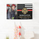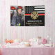 Dieses Design verfügt über eine Feuerwehrflagge mit schwarz-weißen Streifen und einen dünnen roten Streifen. "Glückwunsch" und das Abzeichen eines Feuerwehrmanns sitzen über dem Namen des geschlossen Feuerwehrmanns. Feiern Sie stilvoll mit diesem anpassbaren Foto-Banner!