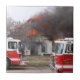 Eine Keramik mit einem Foto von Feuerwehrfahrzeugen vor einem Hausbrand.