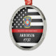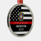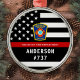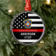 Thin Red Line Feuerwehr Ornament - Amerikanische Flagge in Firefighter Flag Farben, moderne schwarz und rot Design . Stellen Sie sich Ihr Abteilungslogo und den Namen Ihres Feuerwehrmanns zusammen. Dieses personalisierte Feuerwehrschmuck ist ideal für Feuerwehren und Feuerwehr, Ruhestand oder Abschluss Geschenke, Weihnachtsgeschenke für Ihre Feuerwehrleute. Bestellen Sie diese Feuerwehrschmuck Großhandel für Geschenke der Feuerakademie oder Feuerwehr, Feuerwehrfeuertreuen kleine Geschenke. COPYRIGHT © 2020 Judy Burrows, Black Dog Art - Alle Rechte vorbehalten. Feuerwehrleute Personalisierte Feuerlogos dünne rote Linie Metallverzierung