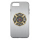 Schönes modernes Feuerwehrlogo. Groß für Feuerwehrmänner und Erstversorger. Gebürsteter metallischer Beschaffenheitsentwurfs-Telefonaluminiumkasten.