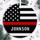 Personalized Thin Red Line Ornament - American flag in Firefighter Flag colors, modern black design . Personalize with firefighter name, or fire department. This personalized firefighter ornament is perfect for fire departments, fire service, or as a memorial keepsake and fire department Christmas gifts o / r stocking stuffers. Order these firefighter ornaments bulk wholesale for the fire academy or fire department ohrfeigen, firefighter christmas stocking stuffers. COPYRIGHT © 2020 Judy Burrows, Black Dog Art - all Rights Reserved. Firefighter Personalized Modern Thin Red Line Metal Ornament