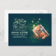 Spezielle und einzigartige Save the Date Postkarte mit wunderschönem whimsicalem Maurerglas mit leuchtenden Lichtern - Glühwürmchen - Blitzen. Moderne und Vintage Save the Date perfekt für rustikale Hochzeitsszenarien.