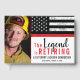 Dieses Design verfügt über eine Feuermelder mit schwarz-weißen Streifen und einen dünnen roten Streifen. Der Text "The Legend is Retiring" steht über dem Namen des pensionierten Feuerwehrmanns, Lieutenant oder Chefs. Feiern Sie stilvoll! Mit einem Foto des ausscheidenden Feuerwehrmanns können Sie sich noch weiter anpassen.