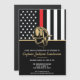 Dieses Design ist mit einer Feuerwehrflagge mit schwarz-weißen Streifen und einem dünnen roten Streifen versehen. Der Helm eines Feuerwehrmanns sitzt über allen Party-Details für den pensionierten Feuerwehrmann, Leutnant oder das Party für das Ruhestand des Chefs. Die Einladungen können auch für einen pensionierten Feuerwehrmann angepasst werden.