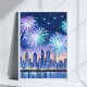 Feuerwerk Stadtlandschaft | Blaue Lofi-Digital-Wasserfarbe-Kunstposter