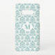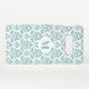 Dekorativer Damast in Vintag beeinflusstem Muster, in aquamarinen Farbdetails auf einer Hintergrundfarbe Ihrer Wahl, mit Buchstabenzentrum zum Personalisieren.