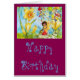Eine skurrile und magische Illustration einer Fee unter den Blume in leuchtend farbenfroher Aquarellkunst. Eine niedliche Geburtstag-Karte mit individualisierbarem Text, geeignet für Kinder oder Märchenfreunde.