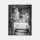 Dieses ist ein Schwarzweiss-Bild der Vintagen Art von einem Fiat 500, cinquecento, in Italien auf einer Fleecedecke. Die Fotografie kennzeichnet eins der ikonenhaften Retro klassischen italienischen Autos, das Fiat 500. Typisch von Italien und von Rom. Ein großes Weihnachtsgeschenk für irgendein Mitglied der Familie oder ein Freund oder eine Freundin.