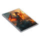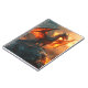 Bild eines Feueratmens, leuchtender roter und gelber Drache stehend auf einem riesigen vulkanischen Felsen in den Bergen.