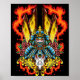 Dieses auffallende Bild zeigt einen Samurai-Krieger inmitten einer feurigen Kulisse. Der Samurai ist mit traditioneller Rüstung verkleidet, mit einer bedrohlichen Maske, die einen dämonischen oder oni-ähnlichen Geist suggeriert. Hinter dem Samurai sind goldene fächerähnliche Objekte, die möglicherweise Flaggen oder Waffen darstellen, von Flammen gerahmt. Der Krieger steht über einer weißen Kitsune, einem mythischen japanischen Fuchsgeist, umgeben von rote Rosen und gelben Chrysanthemen. Die Gesamtkomposition ist dynamisch und visuell ansprechend, die kontrastierenden Farben und kühnen Linien schaffen ein Gefühl von Energie und Intensität.