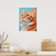 Eine lebendige, orangefarbene Katze blickt nach oben mit durchdringenden blauen Augen, die vor einem ruhigen, türkisfarbenen Hintergrund Vertrauen und Gnade ausstrahlen. Dieses kühne und farbenfrohe Kunstwerk vereint das majestätische Wesen der felinen Schönheit.