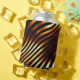 Dieses Design ist mit schwarzen Tigerstreifen versehen, die auf einer glänzenden, orangen und gelben Hintergrundstruktur verziert sind.