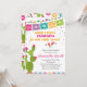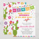 Feiern Sie Ihre kleine señorita mit dieser bunten Fiesta Baby Dusche Einladung. Dieses Design mit einem festlich grünen Kaktus mit rosa Blume, einem hellen Papel-Pikado-Banner, spielerischen Maracas und lebhaften Konfetti-Akzenten ist perfekt für eine mexikanische Babydusche mit boho-thematischer Note. Ideal für Sommerfeiern. BBS203