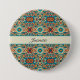 Fügen Sie mit diesem mexikanischen Folk Art Floral Button einen Pop festlichen Flair zu Ihrem Outfit, Tasche oder Event hinzu. Das Design mit einer lebhaften Anordnung stylisierter Blüten in fett türkisfarben, rot, koral und gold spiegelt den fröhlichen Geist der traditionellen mexikanischen Stickerei wider. Ein zentrales Bandbanner ermöglicht den benutzerdefinierbaren Text - perfekt für Namen, kurze Phrasen oder Termine - und macht ihn zu einem einzigartigen Accessoire für Feste, Hochzeiten oder Kulturfeiern.