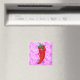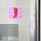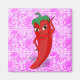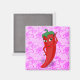 Ein roter und scharfer Pfefferkarikaturencharakter. Originelles Design mit rosa Spitzen-Muster im Hintergrund. Benutzerdefinierte Magnete. Für alle Feste können Sie sich vorstellen! Geschenkidee für würzige Fressliebhaber.