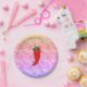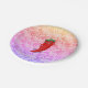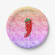 Ein roter und scharfer Pfefferkarikaturencharakter. Originelles Design mit farbenfrohen Spitzen im Hintergrund. Teller für kundenspezifisches Papier. Dekoration für alle Fische, die Sie sich vorstellen können! Geschenkidee für würzige Fressliebhaber.