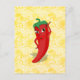 Ein roter und scharfer Pfefferkarikaturencharakter. Originelles Design mit goldenem (gelbem Druck) Spitzenmuster im Hintergrund. Benutzerdefinierte Postkarten. Für alle Feste können Sie sich vorstellen! Geschenkidee für würzige Fressliebhaber.