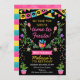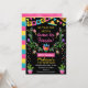 Fiesta mexikanische Flora Geburtstag Einladung Bunte Fest Geburtstagsladen für ein Mädchen mit einem Blumenarrangement, rosa Banner, Papel Picado, Sombrero und Kaktus und mehr auf einem schwarzen Hintergrund.