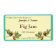 Zwei Feigenbäume mit Feigen sind in den unteren Ecken dieses Labels versteckt, mit einem hellgelben Hintergrund umgeben von einem Rand und einem Hintergrund von türkisfarbenem Grün, was dieses Label zu einem perfekten Etikett für die hausgemachten Feigenkonfitüren oder Konfitüren macht. Der Text befindet sich im Vorlagenformular, sodass Sie ihn auf das ändern können, was Sie möchten.