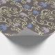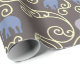 Graue und blaue Elefanten inmitten gelber filigraner Schnörkel vor einem kaffenbraunen Hintergrund.