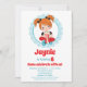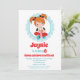 Die Geburtstagseinladung dieses Mädchens enthält ein niedliches Rotkopfmädchen mit einer Kiste Popcorn. Türkisblau, rot und weiß.