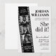 Eine kinematografische schwarz-weiße Abschluss-Einladung mit einer vertikalen Filmstreifen-Fototimeline und eleganter Hollywood-inspirierter Typografie. Perfekt für die Feier von Absolventen, Jahrgangs-Meilensteinen und dem Beginn eines aufregenden neuen Kapitels mit einem zeitlosen Filmstil-Design.