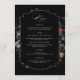 Dieses elegante Menü-Design besticht durch ein holländisches Stillleben aus dem 18. Jahrhundert. Weiße, rote und goldene Tulpen und Wildblumen auf schwarzem Hintergrund mit individuellem Zierschild, ergänzender Blumengrafik und eleganter, fließender Kalligrafie. Auf der Rückseite befindet sich ein optionaler Blumenkranz mit Monogramm-Vorlage.