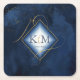 Ein Aquarellhintergrund in Schattierungen von königsblau bis Marine wird durch ein abstrakte edler Goldlinien und glitzernde Lichteffekte ergänzt, um die Teile dieser wunderschönen Hochzeitssuite zu kreieren. Der hier gezeigte Hochzeitszettel-Untersetzer verfügt auch über einen Farbverlauf, einen rautenförmigen Rahmen, in dem die Initialen der Braut und des Bräutigams und das Hochzeitsdatum festgehalten werden. Suchen Sie ID867, um weitere Teile und Farboptionen für dieses Set zu sehen.