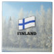 Finnische Flagge mit schneebedeckten Kiefernbäumen im Winter überlagert