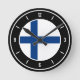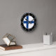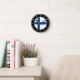 Finnland Flaggen Elegante Uhr mit Finnischer Flagge in der Mitte und herrliche weiße Uhrennummern am Taktrand. Ein zauberhafter schwarzer Hintergrund mit weißen ovalen Elementen vervollständigt das Design und betont die Eleganz. Die wunderschöne Kombination aus Schwarz und Weiß mit der geschickten Integration der nationalen Flaggenfarben machen diese Uhr zum perfekten Geschenk und zum großartigen Stück an der Wand. © 2022 CountriesOfTheWorld