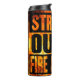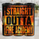 This is a bold, graphic design celebrating graduation from firefighter training. The text "STRAIGHT OUTTA FIRE ACADEMY" is displayed in three lines of heavy, black, distressed font. The entire background is filled with a bright, dynamic image of flames and fire, giving the design an intense and powerful look. It is a celebratory piece often used on apparel for new firefighters or academy graduates.