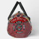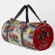 A gray duffle bag is covered in a vibrant pattern of red fire trucks, complete with ladders and fire axes, set against a light-colored ground with yellow splashes. A prominent side pocket, adorned with a red fire department emblem, proudly displays "FIRE RESCUE," "JENNY SAMSMITH," "FIRE DEPARTMENT," and "Vancouver B.C.," creating a personalized and functional item for a firefighter. Personalize with your name and department home town and more. monogram