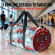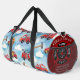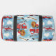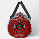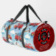 This duffle bag features a charming pattern of red fire trucks, fire hoses, and axes, set against a bright blue sky filled with fluffy white clouds. A side pocket, adorned with a red fire department emblem, is personalized with "FIRE RESCUE," "JENNY SAMSMITH," "FIRE DEPARTMENT," and "Vancouver B.C.," making it a thoughtful gift for a firefighter. Personalize with your name and department home town and more. monogram