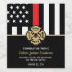 This design features a firemen's flag with black and white stripes, and a thin red line stripe as well. A fireman's badge sits above all of the party details for the retiring firefighter, lieutenant, or chief's retirement party. The invitations can also be customized for a retiring firefighter.