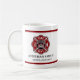 This elegant Firefighter Red Maltese Cross Fire Department Two-Tone Coffee Mug is customisable with Name and Station or Rank. Add personalized name and station to make it truly unique. This mug features a maltese cross with ladder and fire hydrant icon, along with FIRE DEPARTMENT on top and bottom with thin red line on top and bottom of mug, with a firetruck on black circle. Perfect for gift ideas and everyday use.