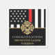 This design features a firemen's flag with black and white stripes, and a thin red line stripe as well. "Congratulations" and a fireman's badge sits above the name of the graduating or retiring firefighter, lieutenant, or chief. Celebrate in style!