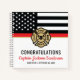 Dieses Design ist mit einer Feuerwehrflagge mit schwarz-weißen Streifen und einem dünnen roten Streifen versehen. "Glückwunsch" und das Abzeichen eines Feuerwehrmanns sitzen über dem Namen des schließend oder pensionierten Feuerwehrmanns, Leutnants oder Chefs. Feiern Sie stilvoll!