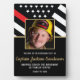Dieses Design ist mit einer Feuerwehrflagge mit schwarz-weißen Streifen und einem dünnen roten Streifen versehen. "Glückwunsch" und das Abzeichen eines Feuerwehrmanns sitzen über dem Namen des schließend oder pensionierten Feuerwehrmanns, Leutnants oder Chefs. Feiern Sie stilvoll! Mit einem Foto des ausscheidenden Feuerwehrmanns können Sie sich noch weiter anpassen.